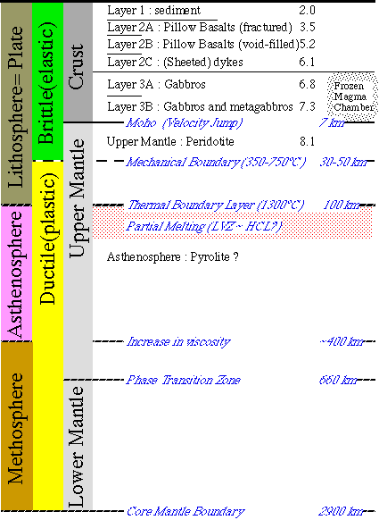 主に玄武岩からなる、大洋底の表層を形成する地層、厚さは約7km。密度??。この下に、化学組成の異なるマントルがある。当然速度構造の不連続がある。その境界面がモホ面である。